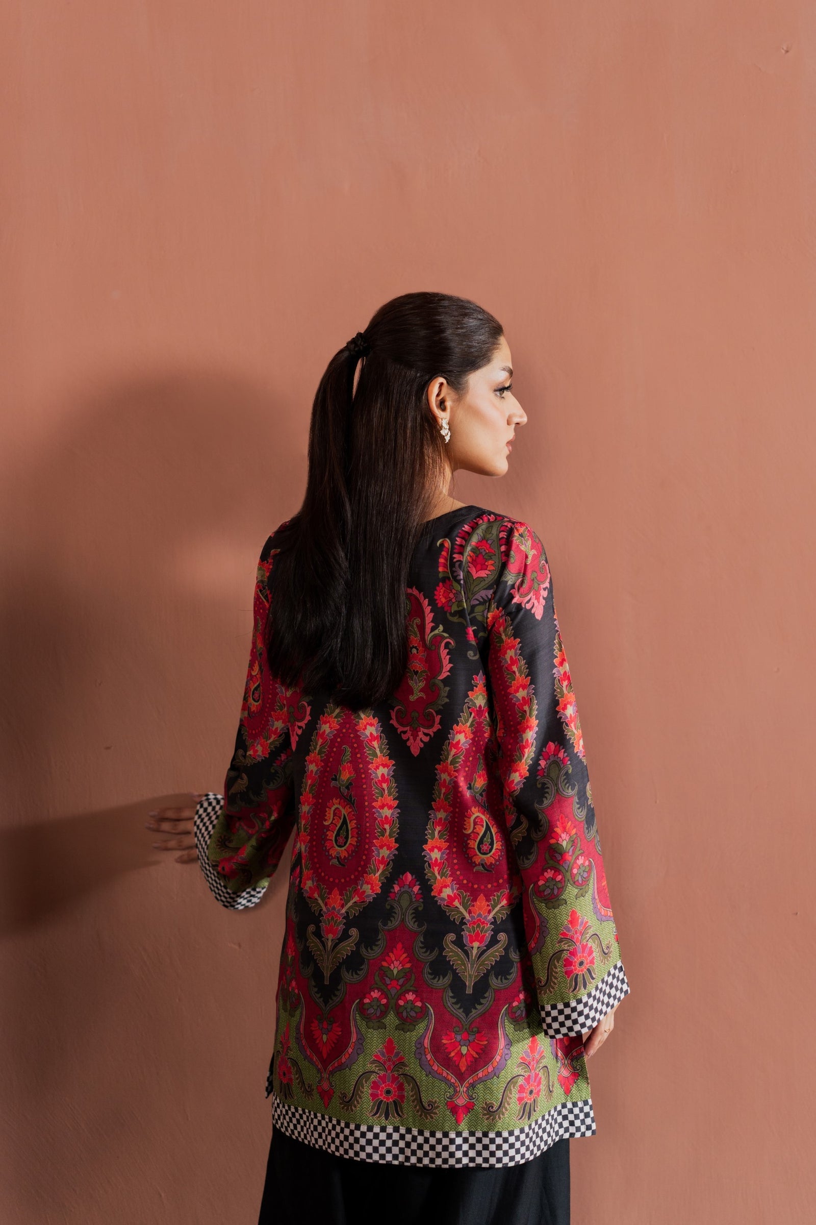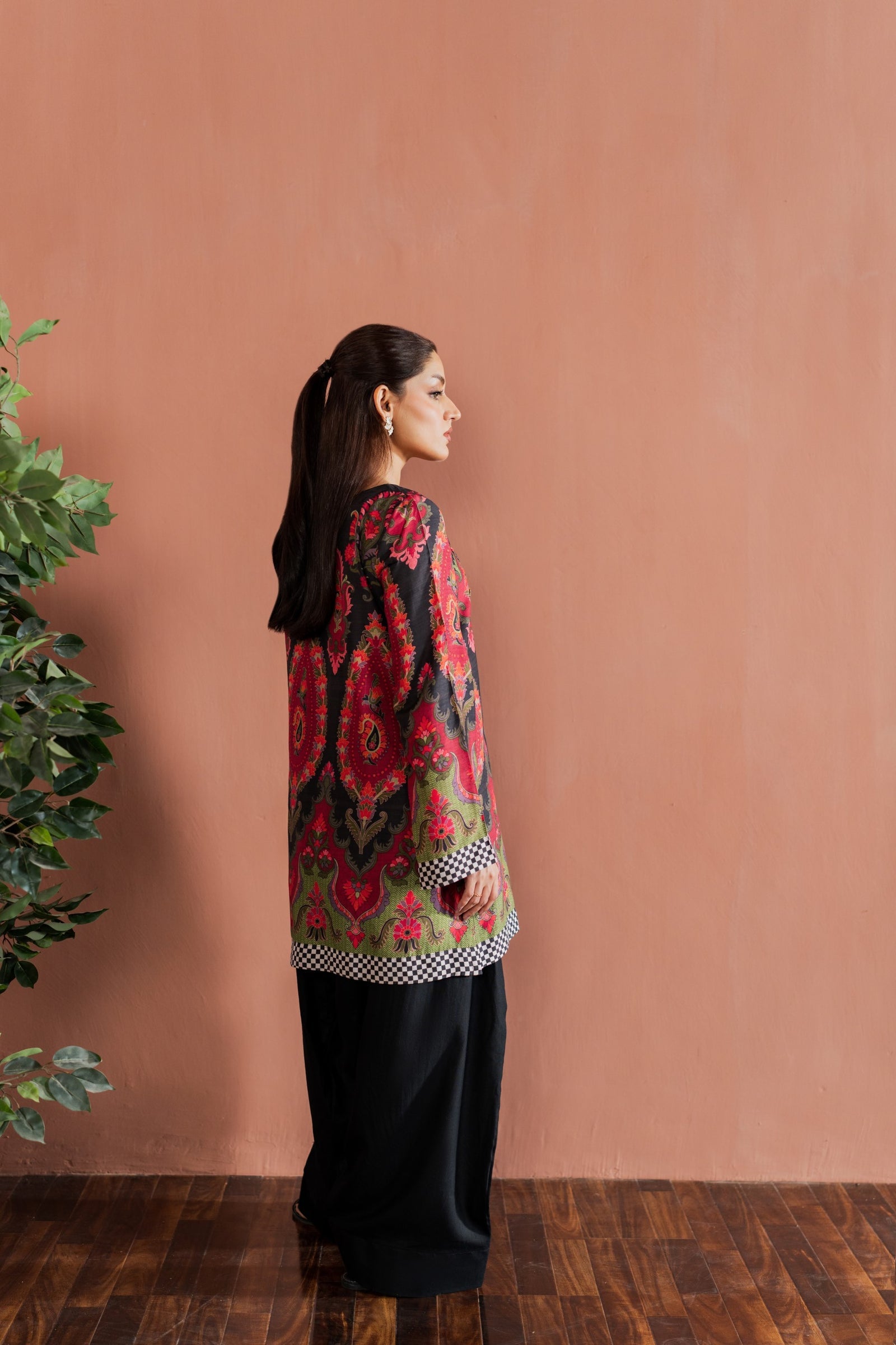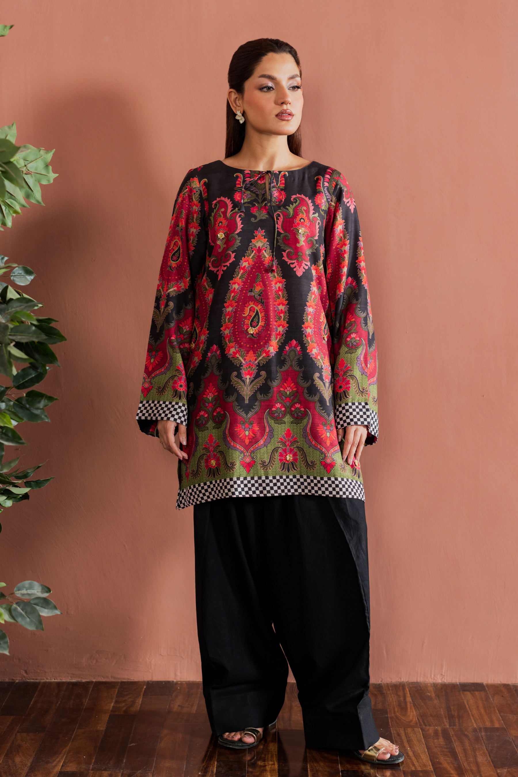 The top features detailed prints with a relaxed fit, paired with matching salwar that add balance and grace to your look. The contrast borders on the sleeves and daman add a refined touch, making it perfect for both casual gatherings and festive evenings.